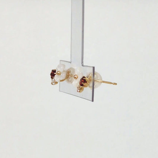 18K/10K White Shell Garnet Flower Stud Earrings (Yellow Gold)