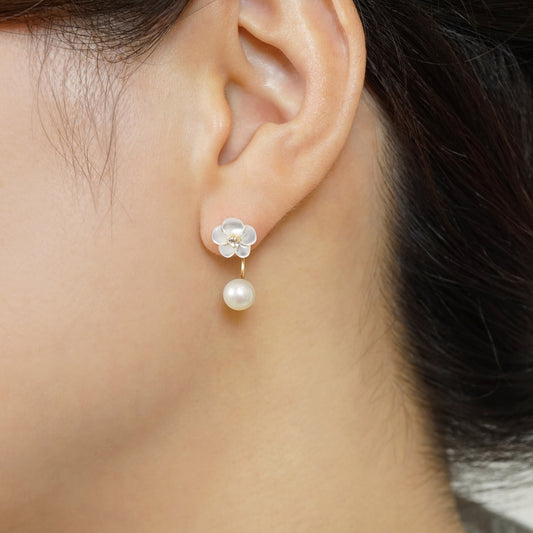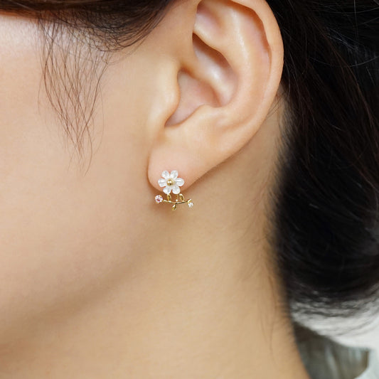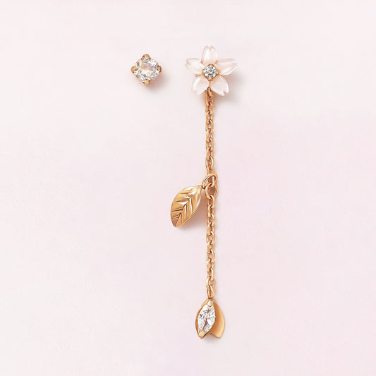 10K / 925 Sterling Silver Pink Shell Cherry Blossoms Double Piercing Chain Earrings