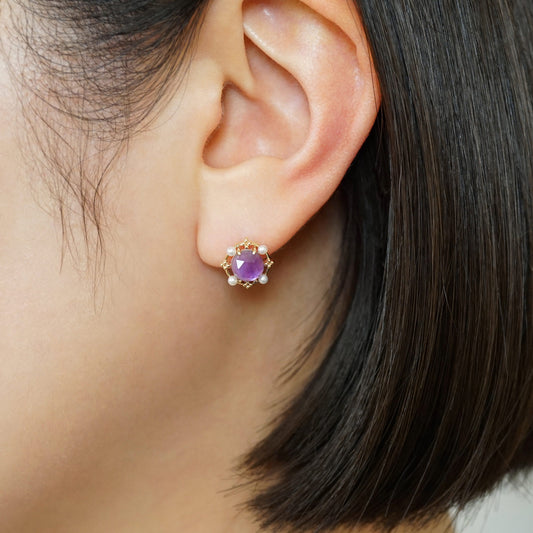 18K/10K Amethyst x Pink Shell Earrings (Yellow Gold)