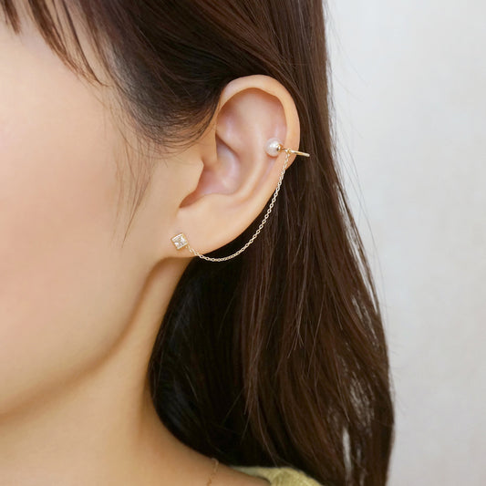 10K Yellow Gold Pearl Chain Ear Cuff Charm
